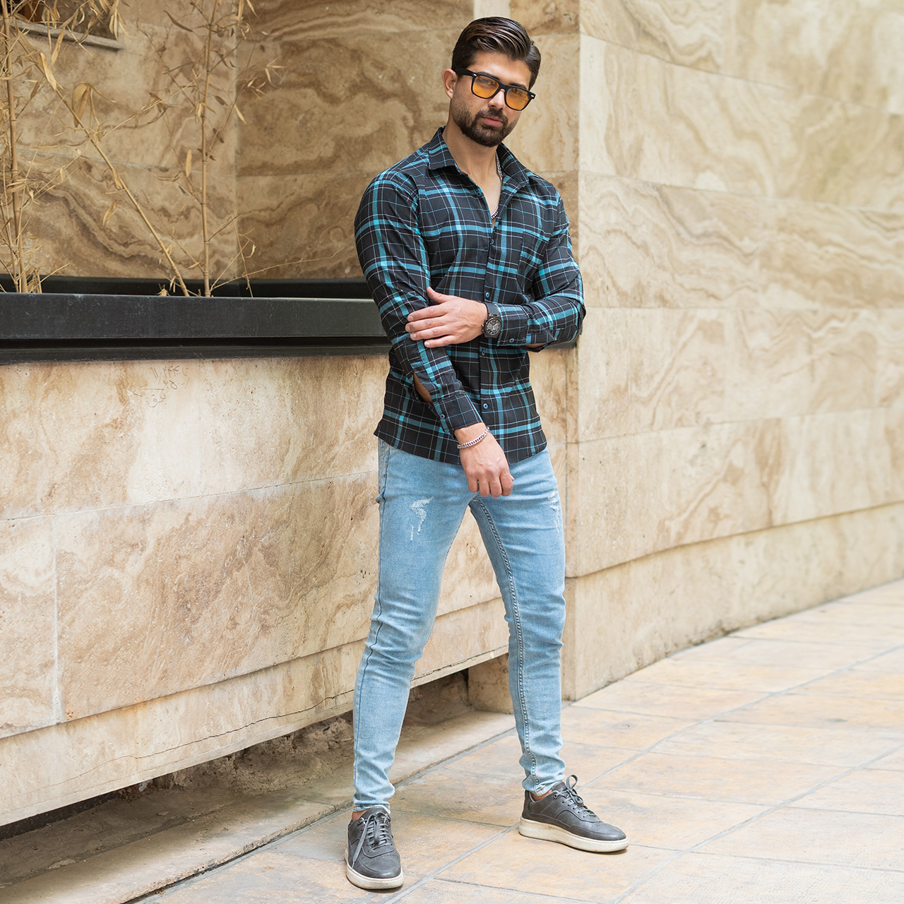 پیراهن مکعبی (T)مشکی آبی مردانه مدل faron