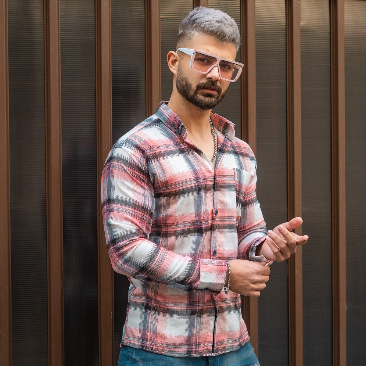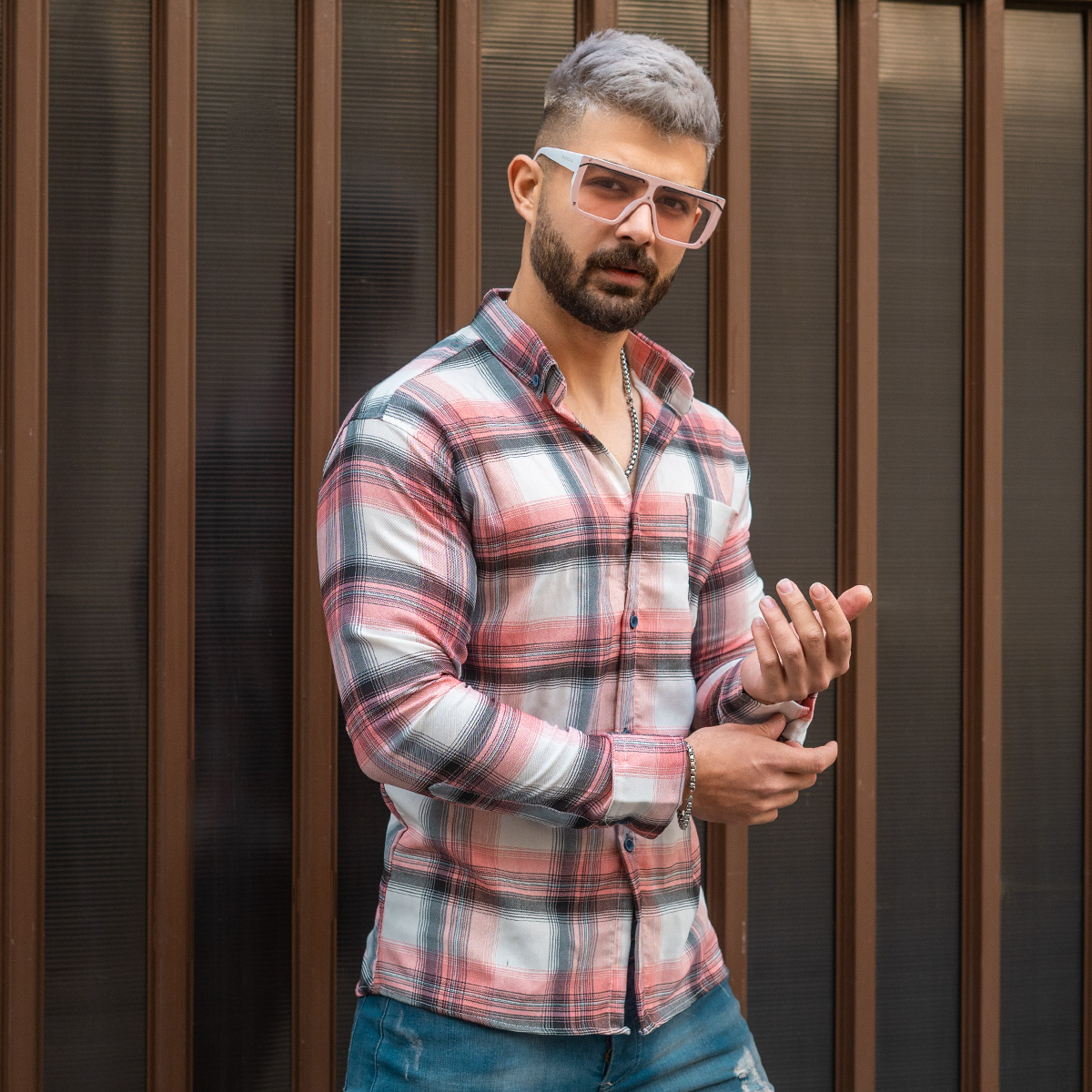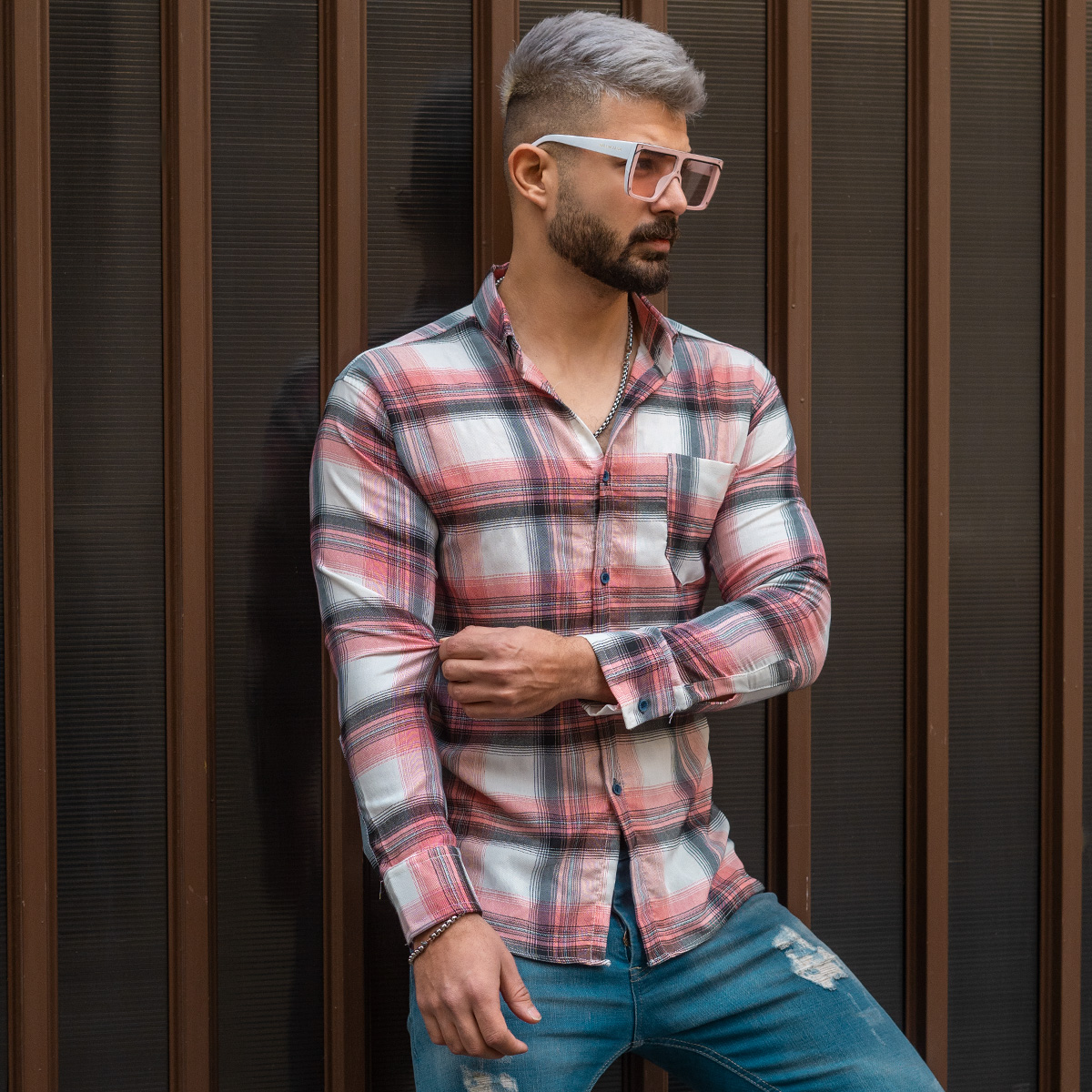 پیراهن مردانه چهارخونه صورتی طوسی مدل alvand
